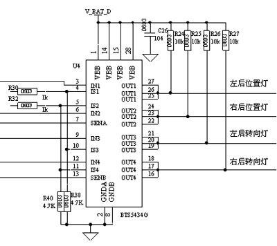 智能車燈控制系統由轎車中12V低壓大電流系統供電,通過MCU控制Infineon智能功率開關實現上述所有功能。在這套為以ROVER平臺開發的燈控系統中使用了Infineon新一代的芯片:BTS6142D和BTS5434G等。