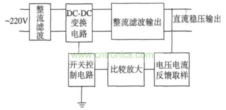 開關直流穩壓電源是基于方波電壓的平均值與其占空比成正比以及電感、電容電路的積分特性而形成的。其基本工作原理是,先對輸入交流電壓整流,從而形成脈動直流電壓,經過DC-DC 變換電路變壓,再通過斬波電路形成了不同脈沖寬度的高頻交流電,然后對其整流濾波輸出需要電壓電流波形。如果輸出電壓波形偏離所需值,便有電流或電壓采樣電路進行取樣反饋,經過與比較電路的電壓值進行參數比較,把差值信號放大,從而控制開關電路的脈沖頻率f 和占空比D,以此來控制輸出端的導通狀態。因此,輸出端便可以得到所需的電壓電流值。
