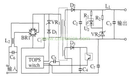 圖6給出了由TOPSwitch 構成的反激式電源的原理圖。其工作過程如下: 輸入交流電經整流橋BR1 整流后再經電容C1 濾波,變為脈動的直流電。