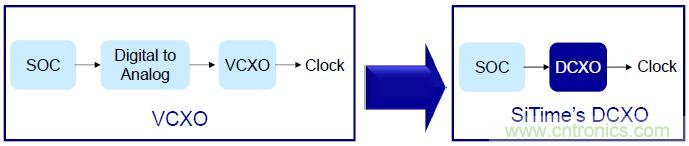 1、方便的1線(one-wire)數字接口、低噪聲和動態頻率控制。石英VCXO則使用一個模擬接口,控制路徑中需要一個外部DAC,可產生額外的系統噪聲。如下圖: