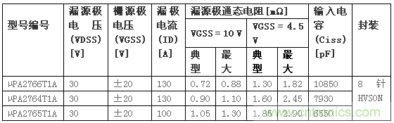 為了滿足這種需要,瑞薩電子在本公司新型低通態電阻工藝的基礎上,研發了一套(三件)MOSFET產品。新型µPA2764T1A、µPA2765T1A 和 µPA2766T1A能夠滿足上述需要,能以更小的規格提供行業領先的電源裝置內的低通態電阻。
