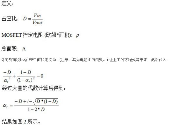 通過圖1,我們知道50%轉換比率時出現(xiàn)最佳傳導損耗極值。但是,在其他轉換比率條件下,可以將損耗降至這一水平以下。附錄給出了進行這種優(yōu)化的數(shù)學計算方法,而圖2顯示了其計算結果。即使在極低的轉換比率條件下,F(xiàn)ET芯片面積的很大一部分都應該用于高側FET。高轉換比率時同樣如此;應該有很大一部分面積用于低側。這些結果是對這一問題的初步研究,其并未包括如高側和低側FET之間的各種具體電阻值,開關速度的影響,或者對這種芯片面積進行封裝相關的成本和電阻等諸多方面。但是,它為確定FET之間的電阻比提供了一個良好的開端,并且應會在FET選擇方面實現(xiàn)更好的整體折中。