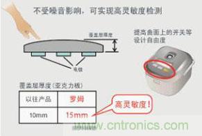 在靈敏度方面,通過獨(dú)創(chuàng)的高速采樣,使該產(chǎn)品在厚達(dá)15mm的覆蓋層中亦可使用。這使以往很難實現(xiàn)的在有一定厚度的圓形面板和曲面面板中應(yīng)用觸控開關(guān)成為可能。