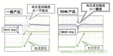 參見表1。基本上,兩種產品都是高效同步整流的降壓型控制器,不僅在重負載時的效率高,輕負載時的效率也很高。標準電壓為0.75V/0.7V,適用低電壓,±1%的精度對于前述的±3%的精度來說具有充分的余量。不僅如此,通過ROHM獨創的H3RegTM控制模式實現了高速負載瞬態響應(圖4),非常適合用作FPGA電源。