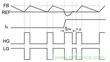 ●tON后HG一旦關斷,低邊MOSFET的柵極(LG)導通,FB引腳電壓開始下降,當與REF電壓達到一致時關斷LG。