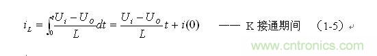 串聯式開關電源最好工作于電流臨界連續狀態,或連續電流狀態。此時,開關電源輸出電壓的調整率為最好,且輸出電壓Uo的紋波也不大。因此,我們可以從電流臨界連續狀態著手進行分析。我們先看(1-6)式: