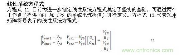 Vcs1 和 Vcs2 可通過(guò)方程式 4 確定。請(qǐng)選擇 R2 的值。最佳實(shí)踐是選擇已經(jīng)存在于電源設(shè)計(jì)中的值,因?yàn)檫@有助于確保網(wǎng)絡(luò)穩(wěn)定性。轉(zhuǎn)換器的反饋電壓 Vfb 可在穩(wěn)壓器產(chǎn)品說(shuō)明書(shū)中找到。這樣我們可手動(dòng)或用數(shù)學(xué)工具解算線(xiàn)性系統(tǒng)方程式,結(jié)果就是 G1 和 GM 電導(dǎo)值。反過(guò)來(lái),其結(jié)果就是 R1 和 RM。