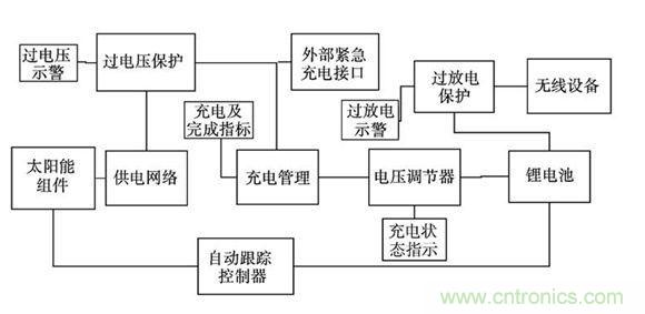 現(xiàn)有的光伏電池,單體的輸出電壓都很低(在1V 以下) ,本設(shè)計中,將多個光伏電池相串聯(lián),組成太陽能組件。通過可以自動調(diào)節(jié)占空比的供電網(wǎng)絡(luò)保證在光照強度變化和負載變化時,輸出電壓基本穩(wěn)定,為充電管理芯片提供穩(wěn)定的電壓輸入。通過對供電網(wǎng)絡(luò)的副邊電壓監(jiān)測,保護充電管理芯片不因電壓過高而損壞。通過對電池兩端的電壓監(jiān)測,保證鋰電池不會因過放電而損壞。由于無線示功儀及其中繼網(wǎng)絡(luò)節(jié)點的供電要求是313V,采用低噪聲、高速度的CMOS型電壓調(diào)節(jié)器。在自動跟蹤控制器作用下,始終保持全天候跟蹤太陽。為了防止因連續(xù)陰雨天而導(dǎo)致的太陽能供電不足,設(shè)計應(yīng)急充電電路,充電期間,無線示功儀及其節(jié)點正常運行。具體系統(tǒng)設(shè)計模塊如圖1 所示。