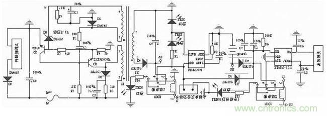 變壓器T1 的122 繞組加至開關(guān)管Q1的集電極( c) ,另一路經(jīng)過R1 為Q1 提供基極電壓。當基極( b)的電壓為高電平時, Q1 開始導(dǎo)通,變壓器T1 的122 繞組中產(chǎn)生1 正2 負的電動勢,經(jīng)T1 耦合,在T1 的324 繞組中產(chǎn)生3 正4 負的感應(yīng)電動勢,此電動勢經(jīng)R5 ,C2 疊加到Q1 的基極( b) ,使Q1 迅速飽和導(dǎo)通。由于變壓器T1 的122 間的電流不能突變,在此過程中會產(chǎn)生1 負2 正的電動勢。變壓器T1 的324 繞組中感應(yīng)出3 負4 正的電動勢,通過R5 , C2 ,使Q1 迅速進入截止狀態(tài)。經(jīng)R1 對C2 的不斷充電, Q1 又開始導(dǎo)通,進入下一輪的開關(guān)振蕩狀態(tài)。在導(dǎo)通期間, T1 變壓器的副邊繞組526,經(jīng)整流二極管D4 向外輸送能量。