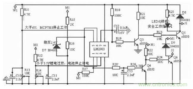 當鋰電池電壓低于315V 時,即電池電量釋放92%以上時,認為不能繼續(xù)放電,否則鋰電池內(nèi)部介質(zhì)會發(fā)生變化,致使充電特性變壞,容量降低等。為此設(shè)計過放電保護控制電路,此電路的具體設(shè)計如圖3,分析如下:采用了LM 2903的1,2,3 腳組成的一路比較器,與外圍器件構(gòu)成過放電壓比較器,R12 , R14分壓后接至LM 2093 的3 腳。當電壓值小于315V 時,分壓值小于214V,LM 2903的1 腳由高電平轉(zhuǎn)變?yōu)榈碗娖剑?Q4 由導(dǎo)通轉(zhuǎn)變?yōu)榻刂範顟B(tài), Q6 飽和導(dǎo)通,JDQ2 工作,同時過放紅色指示燈亮。