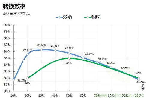 首先我們隨機選擇了一款電源,在沒有使用延長線的時候,分別測試電源的轉換效率、電壓偏離,然后接上延長線,同時測試數據進行對比。