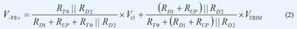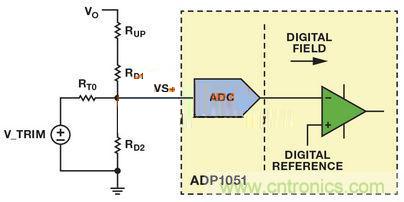 VS+引腳上的正常工作電壓為1V。若 VTRIM為1V左右且RT0遠(yuǎn)大于RD2,則可忽略電路的其余分支部分。復(fù)合網(wǎng)絡(luò)用作簡(jiǎn)單分壓器,并調(diào)節(jié)RUP電阻值,提供類似于模擬控制器的特性,實(shí)現(xiàn)了模擬電源模塊中的電壓向上調(diào)整。