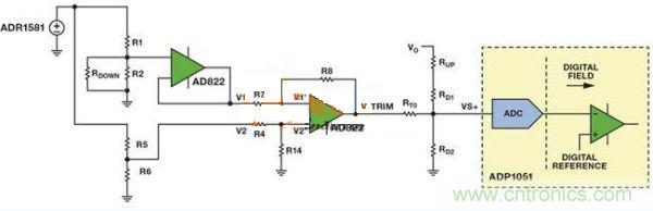 圖5中的電路具有兼容模擬向上或者向下調(diào)壓的功能兩個(gè)電阻分壓器產(chǎn)生兩個(gè)基準(zhǔn)電壓,其中一個(gè)基準(zhǔn)電壓表示模擬控制器所需的輸出基準(zhǔn)電壓,另一個(gè)表示內(nèi)部基準(zhǔn)電壓。利用一個(gè)電壓跟隨器來(lái)避免所需的輸出基準(zhǔn)電壓與后續(xù)電路相互影響。利用AD822 FET輸入運(yùn)算放大器,將所需的輸出基準(zhǔn)電壓(V1)從模擬控制器的內(nèi)部基準(zhǔn)電壓(V2)中去除,得到所需的電壓差。此電路的線性放大增益確保了VTRIM足夠大,從而能對(duì)VVS+產(chǎn)生影響。
