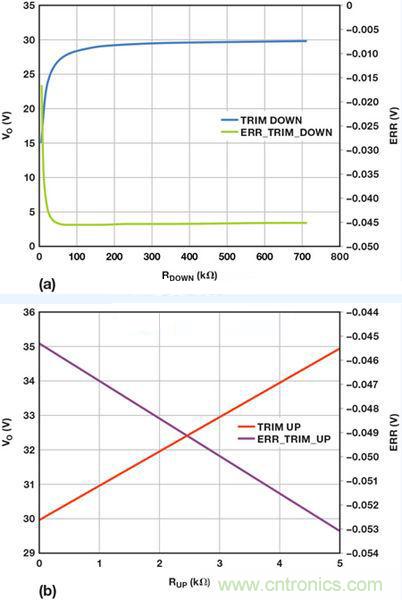 圖6:使用重新配置的反饋網(wǎng)絡(luò)后,調(diào)整ADP1051輸出電壓的計(jì)算結(jié)果:(a)向下調(diào)整 (b)向上調(diào)整
