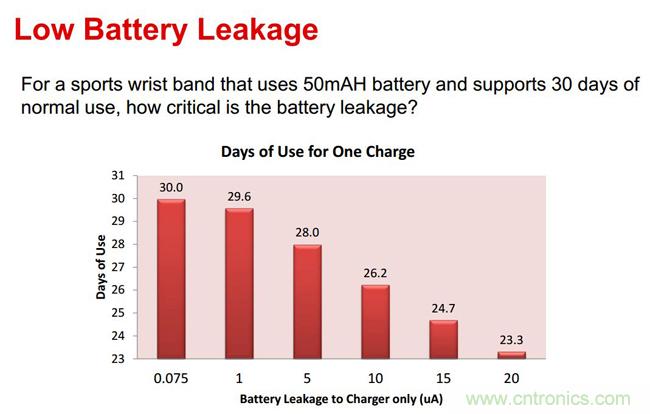 演講中,文博士還提到,可穿戴設(shè)備對于電池模塊的尺寸要求很小,對于電池精度的要求卻是日益提高,如何實現(xiàn)較小的充電終止電流,也是目前急需攻克的難題之一。“基于較小尺寸和充電終止電流的需求,TI推出了為可穿戴設(shè)備等低功耗應(yīng)用量身定制的鋰離子電池充電器:Bq25100。”文博士為我們介紹道,Bq25100采用了0.9×1.6毫米的WCSP封裝,可支持尺寸僅為前代一半的充電器解決方案;Bq25100可以對低至10mA或高達250mA的快速充電電流進行準(zhǔn)確控制,同時還可實現(xiàn)低至1mA的充電終止,從而支持微型鋰離子紐扣電池。此外,Bq25100還支持不足75nA的漏電流,可解決因漏電流帶來的電池損耗問題,延長電池使用時間。