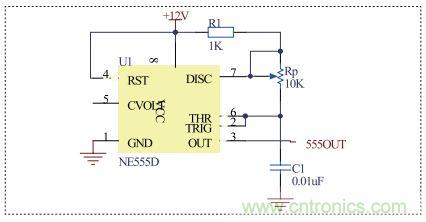 2.1.1 NE555D脈沖發生器模塊 如圖1,根據 T =(R1+Rp)C1,f = 1/T,調節Rp使NE555D輸出一個36.7KHZ的脈沖頻率。