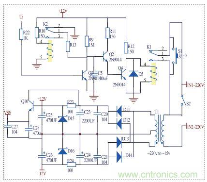 斷電后,繼電器K2閉合,此時C5與R13構成RC放電電路,給C5快速放電。當按一下輕觸復位開關時,充電器重新啟動。當感應負載充滿電(或無感應負載)時,電容C5充電,其電壓為Ut 由公式Ut=12*(1-e-t/R9C5)得:t=-R9C5ln(1-Ut/12) 其中C5=100UF,R9=1MΩ,Ut=1.34V, 經計算得斷電時間:t=10S 實現了10秒自動斷電。在綠燈亮的10秒內只要有感應負載,則Ui為高電平,Q3飽和,電容C5放電。整個充電過程實現智能化斷電。