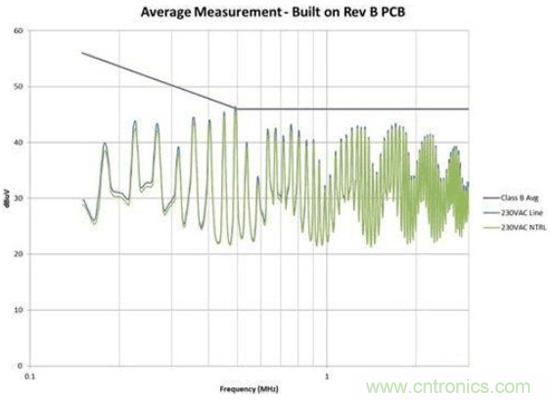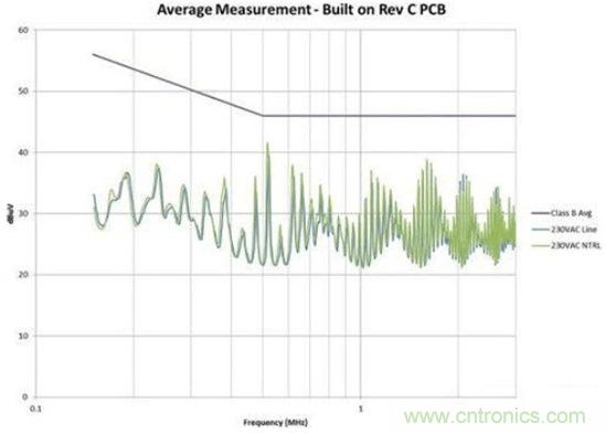 圖4是修改后的效果圖。我們?cè)诠收宵c(diǎn)位置為EMI規(guī)范獲得了大約6dB的裕量。此外,我們還顯著減少了總體EMI簽名。所有這些改善都僅僅是因?yàn)椴季值恼{(diào)整,并未改變電路。如果您的電路具有高電壓開關(guān)并使用了屏蔽距離,您需要非常小心地對(duì)其進(jìn)行控制。