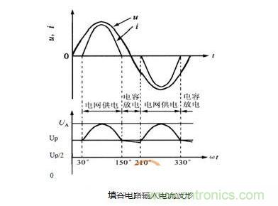 LN系列采用填谷電路進行設計,利用高壓陶瓷電容完美替代鋁電解電容,增加了整流管的導通角,使輸入電流波形從尖峰脈沖變得更接近正弦波,從而大幅度提高電源的功率因素(如表1所示),提高電源的轉換效率,更加利于環保節能,顯著降低總諧波失真。如圖所示: