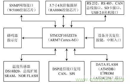 人機交互控制模塊是此IPS 設(shè)計中最為復(fù)雜的數(shù)字化管理模塊, 它不僅監(jiān)測和管理逆變系統(tǒng)的運作, 還要保證IPS 控制器與外界的通信。設(shè)計中要求人機交互模塊能處理復(fù)雜的任務(wù)調(diào)度和很強的突發(fā)訪問( 中斷) 處理, 這就必須有較高運行速度;模塊內(nèi)部還要有豐富的擴展接口提供IPS 與外部即時通信; 具備優(yōu)越的總線控制和訪問機制等。綜合考慮上述需求, 設(shè)計中選擇了意法半導(dǎo)體( ST ) 公司推出的最新32 位單片機STM32F103ZET6 ( 以下簡稱ST M32) 。ST M32 是基于ARM7 Co rtexM3 內(nèi)核架構(gòu)的高速高性能嵌入式控制芯片, 擁有72 MHz 內(nèi)核工作頻率和1. 25 DMIPS/ MHz的指令流水處理速度; 先進的總線結(jié)構(gòu)和多達16 級的帶DMA 功能搶占中斷機制( NIVC) [ 10] 。如圖3 所示,設(shè)計中ST M32 通過SCI 接口及1 根中斷請求/ 接收線與DSP 2808 進行通信; 利用片上擴展的其中2 個SCI 口分別作為RS 232 和RS 485通信協(xié)議口; CAN 總線接口和U SB 總線通過共享數(shù)據(jù)緩沖區(qū)和中斷向量入口與外界互聯(lián)通信;通過STM32 的26 位地址總線和16 數(shù)據(jù)總線擴展外掛256 KB SRAM 和4 MB N OR FLASH, 以及8 位數(shù)據(jù)口的LCM 模塊RA8806 以及用于SNMP 的16 位并行數(shù)據(jù)的以太網(wǎng)芯片W5100; 啟用ST M32 的SDIO 總線以啟用用戶插入SD 卡存儲查詢IPS 狀態(tài)數(shù)據(jù)功能; 啟用現(xiàn)場環(huán)境下獨立時鐘看門狗電路和STM32 特有的窗口看門狗;啟用內(nèi)部芯片溫度傳感器采樣監(jiān)控, RC時鐘源以及外部喚醒功能; 通過通用引腳接入DS18B20 溫度傳感器對環(huán)境溫度的采樣, 預(yù)留I2 C 方式E2PROM 和SPI 方式的DA TA FLASH 接口為產(chǎn)品后續(xù)升級開發(fā)做準備。