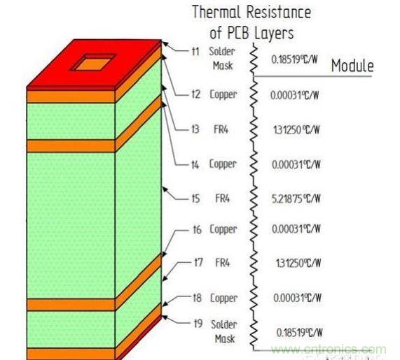 請(qǐng)注意,這些值只是一個(gè)通孔本身的熱阻,并未考慮穿過電路板的每一段與圍繞它的材料是橫向連接的。