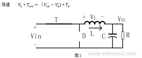 當(dāng)PWM驅(qū)動高電平使得NMOS管T導(dǎo)通的時(shí)候,忽略MOS管的導(dǎo)通壓降,等效如圖2,電感電流呈線性上升,MOS導(dǎo)通時(shí)電感正向伏秒為: