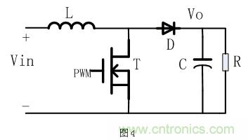 Boost升壓型電路拓?fù)洌袝r(shí)又稱為step-up電路,其典型的電路結(jié)構(gòu)如下圖4所示: