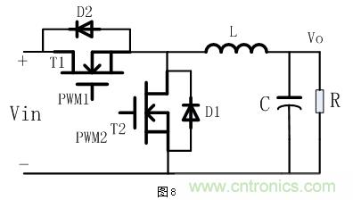 當(dāng)T2管截止時(shí),T1管與D1、L等器件構(gòu)成了Buck型降壓電路,可以實(shí)現(xiàn)對后級的負(fù)載進(jìn)行供電;反之,當(dāng)T1管截止,T2管與D2二極管、L等器件構(gòu)成了Boost升壓電路,對前端電源進(jìn)行能量補(bǔ)充。目前對T1和T2管的控制以模擬方式控制相對還是比較困難,均是以數(shù)字控制方式為主。