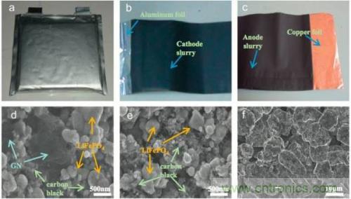 實驗中楊全紅的團隊制作了兩種電池,一種是普通的對照組電池,使用了7%的炭黑和3%的導(dǎo)電石墨,實驗組則使用1%的石墨烯和1%炭黑作為導(dǎo)電劑。試驗結(jié)果顯示,在相同的涂布量的前提下,使用石墨烯的實驗組電池容量(0.5C充放電)要明顯高于對照組電池,并且兩者的循環(huán)性能接近,表明石墨烯能夠搭建起更為高效的導(dǎo)電網(wǎng)絡(luò),從而減少導(dǎo)電劑的用量,提高鋰離子電池的容量(10%),降低電池的極化,提升電池的能量密度。
