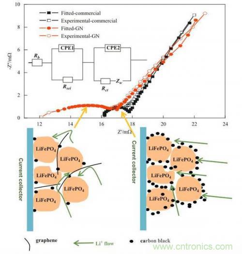 EIS分析顯示,添加石墨烯的實驗組電池的歐姆阻抗要明顯低于對照組電池,這主要得益于石墨烯的片狀結(jié)構(gòu)能夠于活性物質(zhì)顆粒形成很好的接觸,降低接觸電阻,但是在高頻段的電荷交換阻抗,實驗組電池要明顯高于對照組電池,這表明石墨烯的加入影響了Li+在電極內(nèi)的擴散。仿真結(jié)果顯示,主要是由于石墨烯的片狀結(jié)構(gòu)對Li+的擴散形成了阻礙,導(dǎo)致Li+的擴撒路徑延長,從而造成了添加石墨烯的鋰離子電池在大電流下極化增加,導(dǎo)致電池的放電容量下降。而傳統(tǒng)的炭黑、導(dǎo)電碳纖維和導(dǎo)電石墨等材料,由于橫截面較小,因此對Li+的擴散阻礙較小,對鋰離子電池大電流放電性能影響不大。