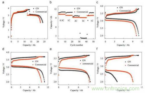 在隨后的倍率實驗中發(fā)現(xiàn),在0.5C、1C和2C的充放電倍率下,實驗組的石墨烯導(dǎo)電劑電池相比于對照組電池都表出了更高的容量和更小的極化,但是當(dāng)充放電倍率提高到3C時,實驗組電池容量迅速下降到4Ah以下,而對照組電池的容量仍然保持在9Ah左右,繼續(xù)將放電倍率提高到4C,實驗組石墨烯導(dǎo)電劑電池由于極化太大,已經(jīng)無法放電,而對照組電池則相對穩(wěn)定。
