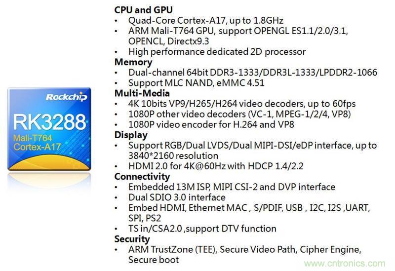 性能方面,RK3288基于28nm HKMG工藝,處理器采用了四核ARM Cortex-A17,主頻達到了1.8GHz。DDR控制器采用雙通道64bits DDR3/DDR3L/LPDDR2設計。GPU采用四核Mali-T7系列GPU,頻率高達600MHz。該芯片內置了2D/3D圖形GPU加速處理器,完美支持OpenGL ES 1.1/2.0/3.1、OpenCL 1.1、DirectX9.3,在3D效果方面相較同類產品有較大的提升。RK3288還支持全部主流視頻格式解碼,支持H.265和4Kx2K分辨率視頻解碼。