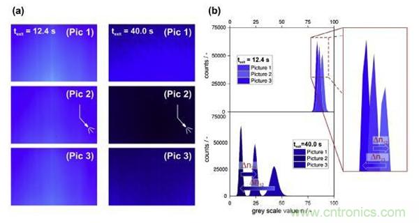 圖5.(a)在兩個干燥時刻,各自連續(xù)拍攝的三張照片的比較。捕捉第二張照片時,用加壓空氣噴嘴向照相區(qū)域涂層上直接噴射空氣氣流。(b)在較短干燥時間(texit=12.4s)時,三張照片中獲得的nmax都很大,差值Δn12和Δn23小并且都落在試驗值偏差范圍內(nèi)。而texit=40.0s時,三個nmax都很小,噴嘴作用導(dǎo)致的差值Δn12和Δn23很大。