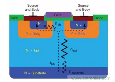 圖1顯示了一種傳統(tǒng)平面式高壓MOSFET的簡單結(jié)構(gòu)。平面式MOSFET通常具有高單位芯片面積漏源導通電阻,并伴隨相對更高的漏源電阻。使用高單元密度和大管芯尺寸可實現(xiàn)較低的RDS(on)值。但大單元密度和管芯尺寸還伴隨高柵極和輸出電荷,這會增加開關(guān)損耗和成本。另外還存在對于總硅片電阻能夠達到多低的限制。器件的總RDS(on)可表示為通道、epi和襯底三個分量之和: