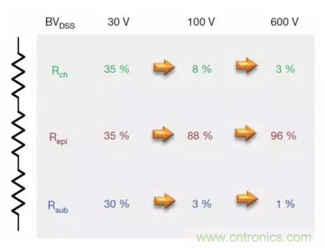 圖2顯示平面式MOSFET情況下構(gòu)成RDS(on) 的各個分量。對于低壓MOSFET,三個分量是相似的。但隨著額定電壓增加,外延層需要更厚和更輕摻雜,以阻斷高壓。額定電壓每增加一倍,維持相同的RDS(on)所需的面積就增加為原來的五倍以上。對于額定電壓為600V的MOSFET,超過95%的電阻來自外延層。顯然,要想顯著減小RDS(on)的值,就需要找到一種對漂移區(qū)進行重摻雜的方法,并大幅減小epi電阻。