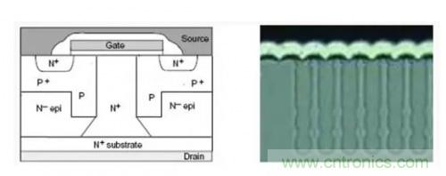 通常,高壓的功率MOSFET采用平面型結(jié)構(gòu),其中,厚的低摻雜的N-的外延層,即epi層,用來保證具有足夠的擊穿電壓,低摻雜的N-的epi層的尺寸越厚,耐壓的額定值越大,但是其導通電阻也急劇的增大。導通電阻隨電壓以2.4-2.6次方增長,這樣,就降低的電流的額定值。為了得到一定的導通電阻值,就必須增大硅片的面積,成本隨之增加。如果類似于IGBT引入少數(shù)載流子導電,可以降低導通壓降,但是少數(shù)載流子的引入會降低工作的開關(guān)頻率,并產(chǎn)生關(guān)斷的電流拖尾,從而增加開關(guān)損耗。