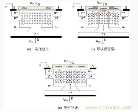 當G極加上驅(qū)動電壓時,在G極的表面將積累正電荷,同時,吸引P區(qū)的電子到表面,將P區(qū)表面空穴中和,在柵極下面形成耗盡層,如圖5示。隨著G極的電壓提高,柵極表面正電荷增強,進一步吸引P區(qū)電子到表面,這樣,在G極下面的P型的溝道區(qū)中,積累負電荷,形成N型的反型層,同時,由于更多負電荷在P型表面積累,一些負電荷將擴散進入原來完全耗盡的垂直的 N+,橫向的耗盡層越來越減小,橫向的電場也越來越小。G極的電壓進一步提高,P區(qū)更寬范圍形成N型的反型層,最后,N+區(qū)域回到原來的高滲雜的狀態(tài),這樣,就形成的低導通電阻的電流路徑,如圖5(c)所示。
