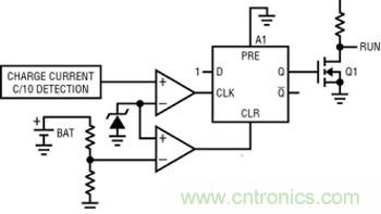 前述電路的方框圖如圖 1 所示。該電路基于一個(gè) D 觸發(fā)器。隨著充電電流值降至預(yù)設(shè)定的 C/10,D 觸發(fā)器時(shí)鐘變?yōu)楦唠娖剑獠烤w管 Q1 將 RUN 引腳拉至地,并關(guān)斷 LTC4012。電池充電,電壓接近最大值。隨著充電器關(guān)斷,電池開始放電,最終達(dá)到最小電壓,D 觸發(fā)器清零,然后 Q1 關(guān)斷,充電周期重復(fù)。