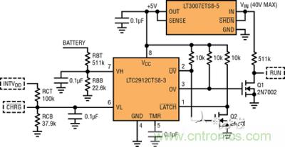 如果電池充電,那么 LTC2912-3 的 VH 輸入上的電壓高于 0.5V,/UV 輸出為高電平。Q2 接通,/LATCH 引腳為低,輸出 OV 閉鎖在高電平狀態(tài)。相應(yīng)地,Q1 接通,LTC4012 處于關(guān)斷模式。只要 /LATCH 引腳為低,OV 閉鎖在高電平狀態(tài),LTC4012 就繼續(xù)保持關(guān)斷狀態(tài)。