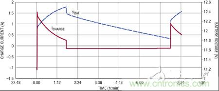 為了驗(yàn)證電路功能,將一個(gè)數(shù)據(jù)記錄器連至充電器-電池系統(tǒng)。對(duì)電池電壓和電流進(jìn)行采樣和存儲(chǔ)。為了方便電池的自放電并縮短放電時(shí)間,在電池端子之間連接一個(gè) 100Ω 電阻器。所產(chǎn)生的圖形如圖 3 所示。在周期一開始時(shí),輸入電壓 VIN 被斷開,電池放電,并向負(fù)載提供“負(fù)”電流。然后,加上 VIN 后,充電周期啟動(dòng),“正”的充電電流流進(jìn)電池。當(dāng)電池充滿電以后,充電器關(guān)斷,電池開始自放電。當(dāng)電池電壓達(dá)到最小值時(shí),充電器接通,周期自我重復(fù)。