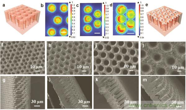b-d)多孔銅集流體上表面的電流密度分布模擬結果,圖中標尺為10 μm。
