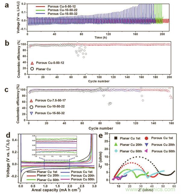 c)鋰沉積在多孔Cu-7.5-50-17、Cu-10-50-22、Cu-15-50-32時的循環穩定性能及庫倫效率