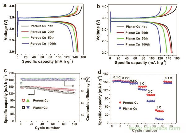 c)平板銅和多孔銅為集流體時,Li / LFP電池的循環性能比較