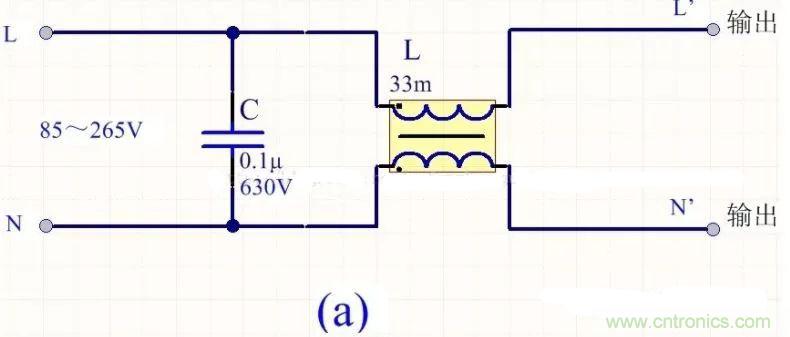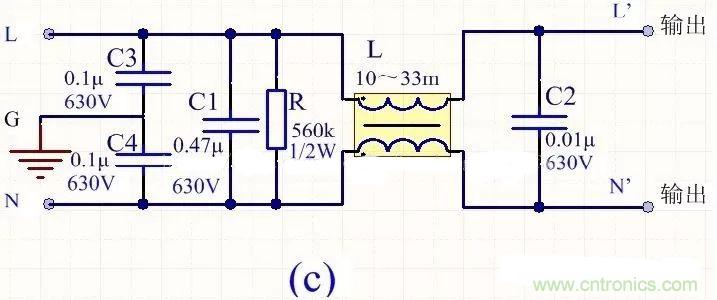 為降低成本和減小體積,開關電源一般采用簡易的EMI濾波器,主要包括共模扼流圈L和濾波電容,以下四種可以根據情況進行選擇: