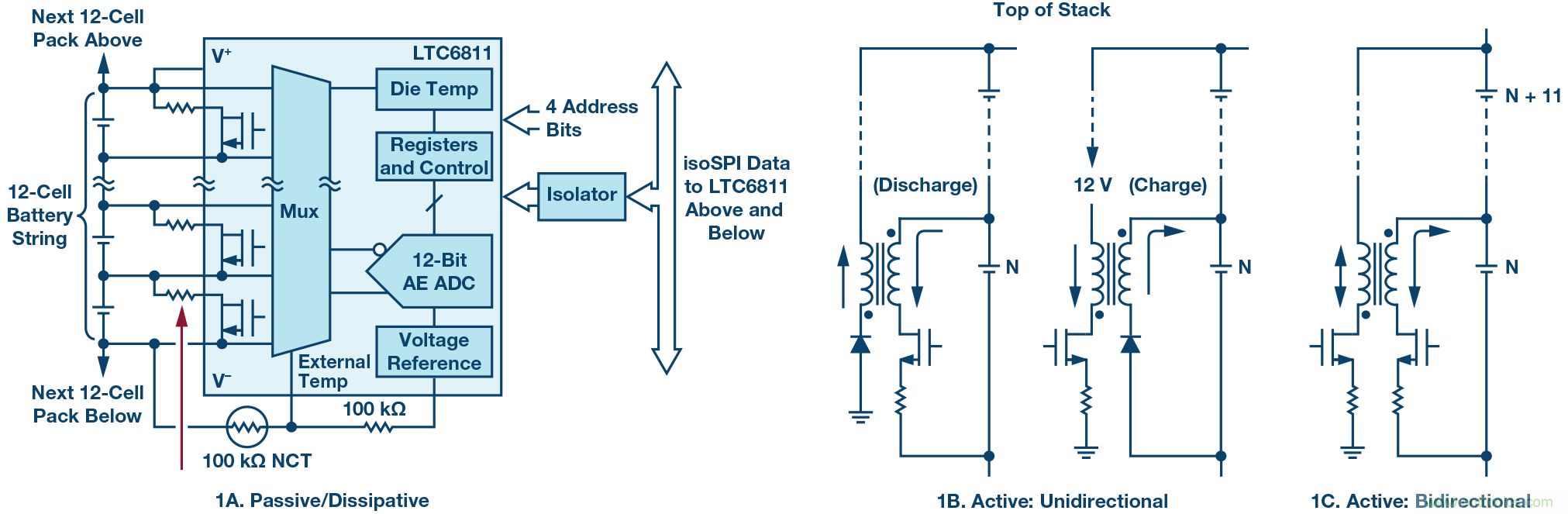 如圖1a所示,被動均衡既簡單又便宜。然而,被動均衡也非常緩慢,會在電池包內部產生有害的熱量,均衡結果是將所有電池單元的剩余容量減少到與電池包中SoC最低的電池單元一致。此外,被動均衡缺乏能力有效解決另一種常見現象——容量不匹配引起的SoC誤差。所有電池單元在老化時都會損失容量,損失速率往往不同,原因類似于串聯電池單元的充電狀態隨著時間推移而出現差異。電池包電流均等地流入和流出所有串聯電池單元,因此電池包的可用容量取決于電池包中容量最低的電池單元。只有圖1b和圖1c所示的主動均衡方法可以讓電荷在整個電池包中重新分配,補償電池單元間不匹配所造成的容量損失。
