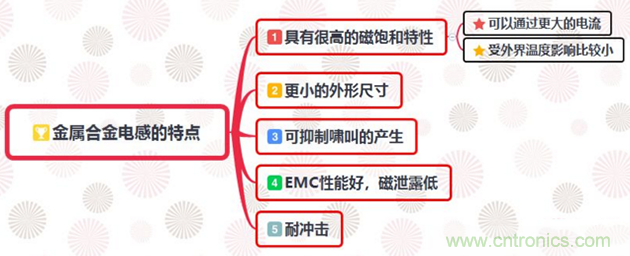 同等特性時(感值、飽和電流等),金屬合金功率電感比鐵氧體功率電感的外形尺寸小50%左右,可以實現小型化和薄型化。