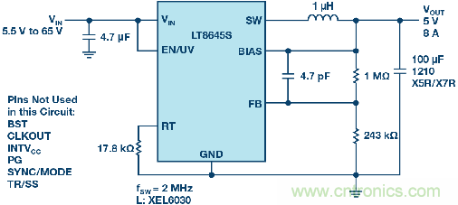 圖1. 提供5 V、8 A、2 MHz輸出的LT8645S原理圖