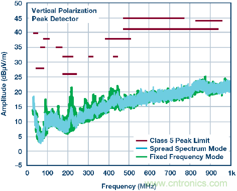 在整個(gè)負(fù)載范圍內(nèi),LT8645S可以輕松符合汽車CISPR25、Class 5峰值EMI限制。還可以使用擴(kuò)頻頻率調(diào)制進(jìn)一步降低EMI水平(圖2)。LT8645S內(nèi)置高效率頂部和底部功率開(kāi)關(guān),并將必要的升壓二極管、振蕩器以及控制和邏輯電路集成到單個(gè)芯片中。低紋波突發(fā)工作模式可在低輸出電流下保持高效率,同時(shí)使輸出紋波低于10 mV p-p。最后,LT8645S采用小尺寸散熱增強(qiáng)型4 mm×6 mm、32引腳LQFN封裝。