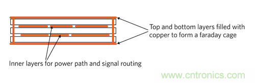 b.PCB 的頂層和底層布局帶有屏蔽接地區(qū)域,利用一個(gè)過孔將其連接起來,以模擬法拉第籠。所有高 di/dt 環(huán)路布置在 PCB 的內(nèi)層,所以法拉第籠就能夠屏蔽電磁場(chǎng), 防止向外輻射。該方法成本較低,通常足以抑制 EMI。圖 10 為該技術(shù)的示意圖。
