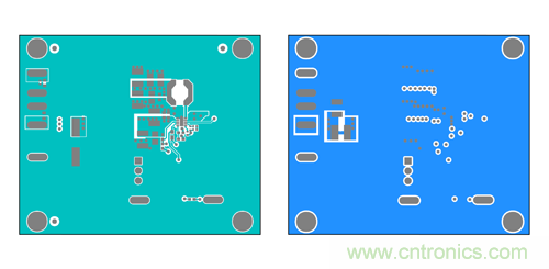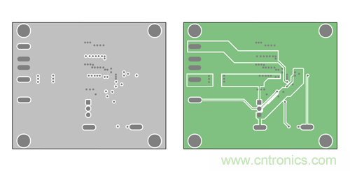 現(xiàn)在,我們以 Maxim 的喜馬拉雅 MAX17502 寬輸入范圍 IC 為例,器件工作在 4.5-60Vin、0.9- 54Vout,提供 1A 負(fù)載電流。以下為 MAX17502 EMI 評(píng)估板 PCB 的布局,采用了法拉第屏蔽技術(shù) (b)。圖 11a 所示為頂層和底層,用作法拉第屏蔽;圖 11b 所示為內(nèi)部第二層和第三層,用于布線。這里的第二層用作額外屏蔽,也可用于布線。該布局中,高 di/dt 電流環(huán)路 I1 和 I2 布置在第三層, 被完整籠罩在法拉第屏蔽中。